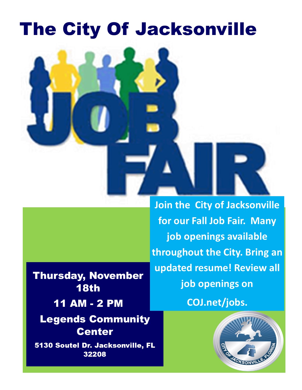 Join the City of Jacksonville for our Fall Job Fair. Many job openings available throughout the City. Bring an updated resume! Review all job openings on COJ.net/jobs. Thursday, November 18, 2021, 11:00 AM - 2:00 PM at the Legends Community Center, 5130 Soutel Dr. Jacksonville, FL 32208.