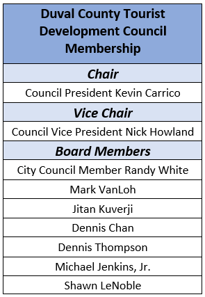 The TDC is composed of nine members appointed by the City Council in accordance with the following requirements: (1) the City Council President shall be a member ex officio; (2) the City Council Vice President shall be a member ex officio; (3) one member shall be a current City Council member, with preference given to a past City Council President or a City Council member with an interest and experience in tourism; (4) three members shall be owners or operators of motels, hotels, recreational vehicle parks or other tourist accommodations located in the General Services District and subject to the tourist development tax levied by the city; (5) one member shall have experience and background in the commercial airline industry or the Jacksonville Aviation Authority; and (6) two members shall be persons who are involved in the tourist industry and who have demonstrated an interest in tourist development. Members shall serve without compensation, pension or retirement benefits; however members may be compensated for travel expenses as provided in Chapter 106, Part 7, Ordinance Code.The TDC carries out its work via bi-monthly meetings of the full TDC.