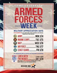 Come celebrate Armed Forces Week at MISSION BBQ. There will be a free sandwich for all active duty service members and veterans to thank them for their service throughout the entire week. Please see below for the appropriate day based on your branch of service.
