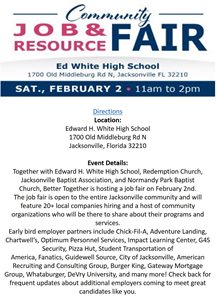 The job fair is open to the entire Jacksonville community and will feature 20+ local companies hiring and a host of community organizations who will be there to share about their programs and services.