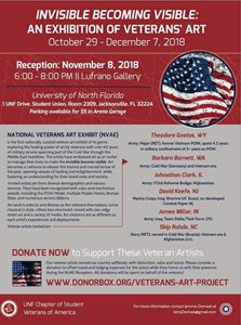 The "Invisible Becoming Visible: An Exhibition of Veterans' Art" will be on display at the University of North Florida from October 29, 2018 - December 7, 2018. The reception for the exhibit will be on November 8, 2018 at the Lufrano Gallery from 6:00 P.M. - 8:00 P.M.
