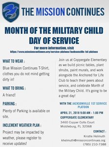 Join The Mission Continues at Coppergate Elementary to build picnic tables, plant shrubs, paint murals, and work alongside the Anchored for Life Club to teach their peers about service, and celebrate Month of the Military Child.