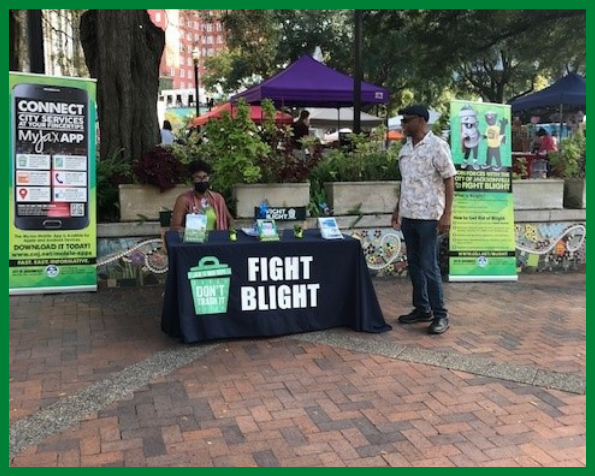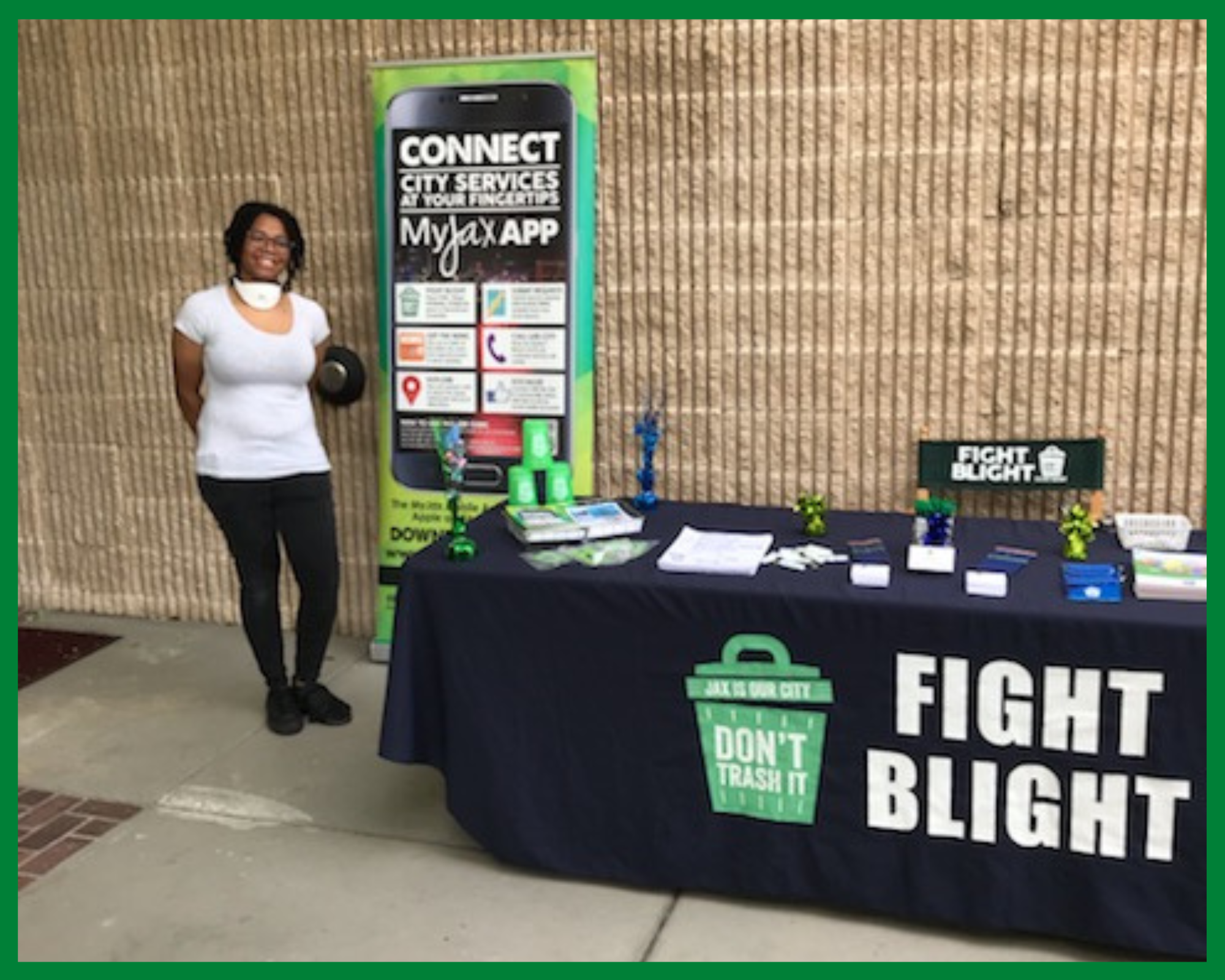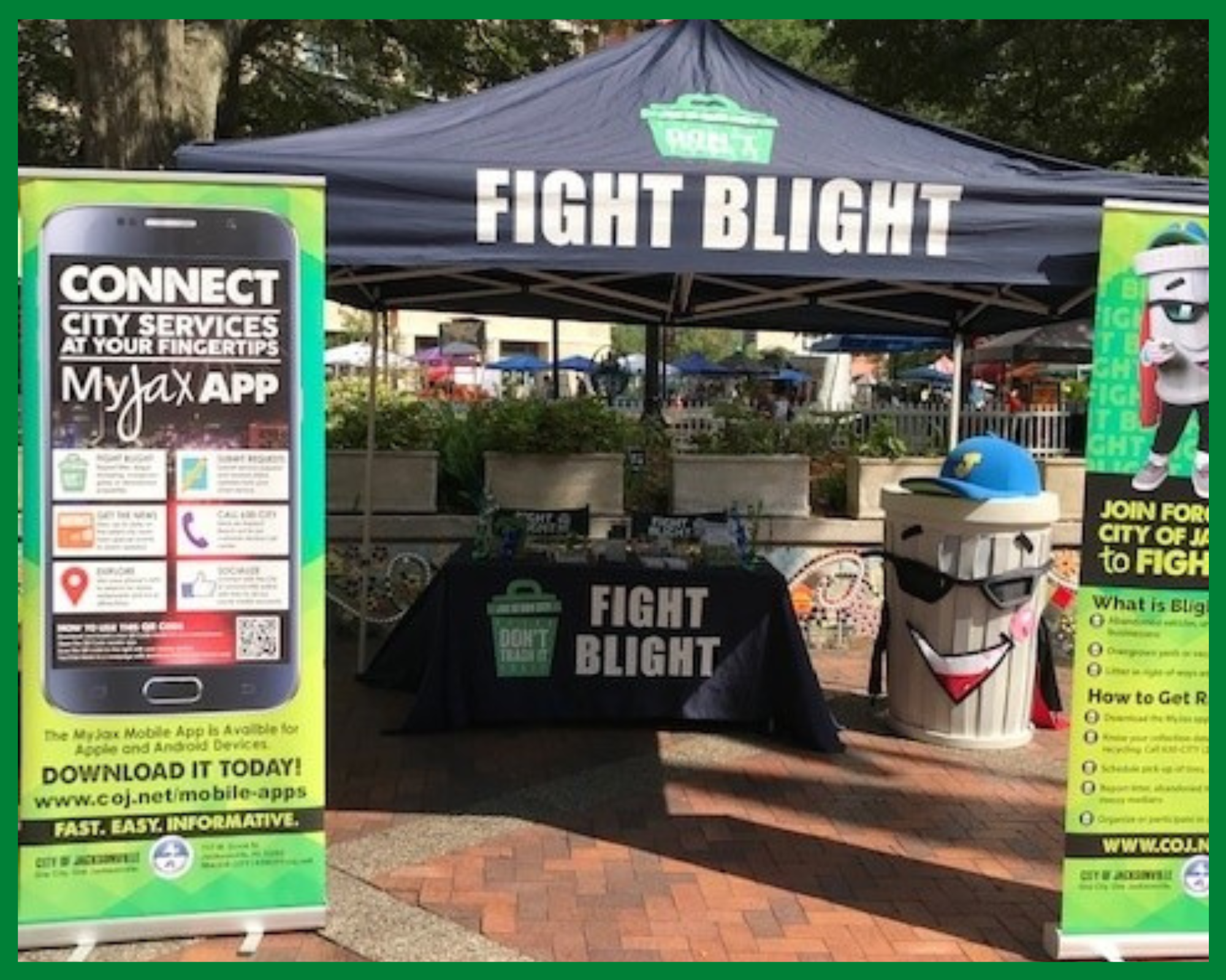 The Blight booth was one of the busiest vendors at this well attended event, with more than 100 citizens stopping by to learn more about how they can help Fight Blight in their local neighborhoods. There were several citizens from multiple communities that did not know about Fight Blight or the MyJax app, and being able to educate them was awesome. Our booth staff assisted citizens in downloading and operaing the MyJax app to report problems as well as find out information about trash pickup.