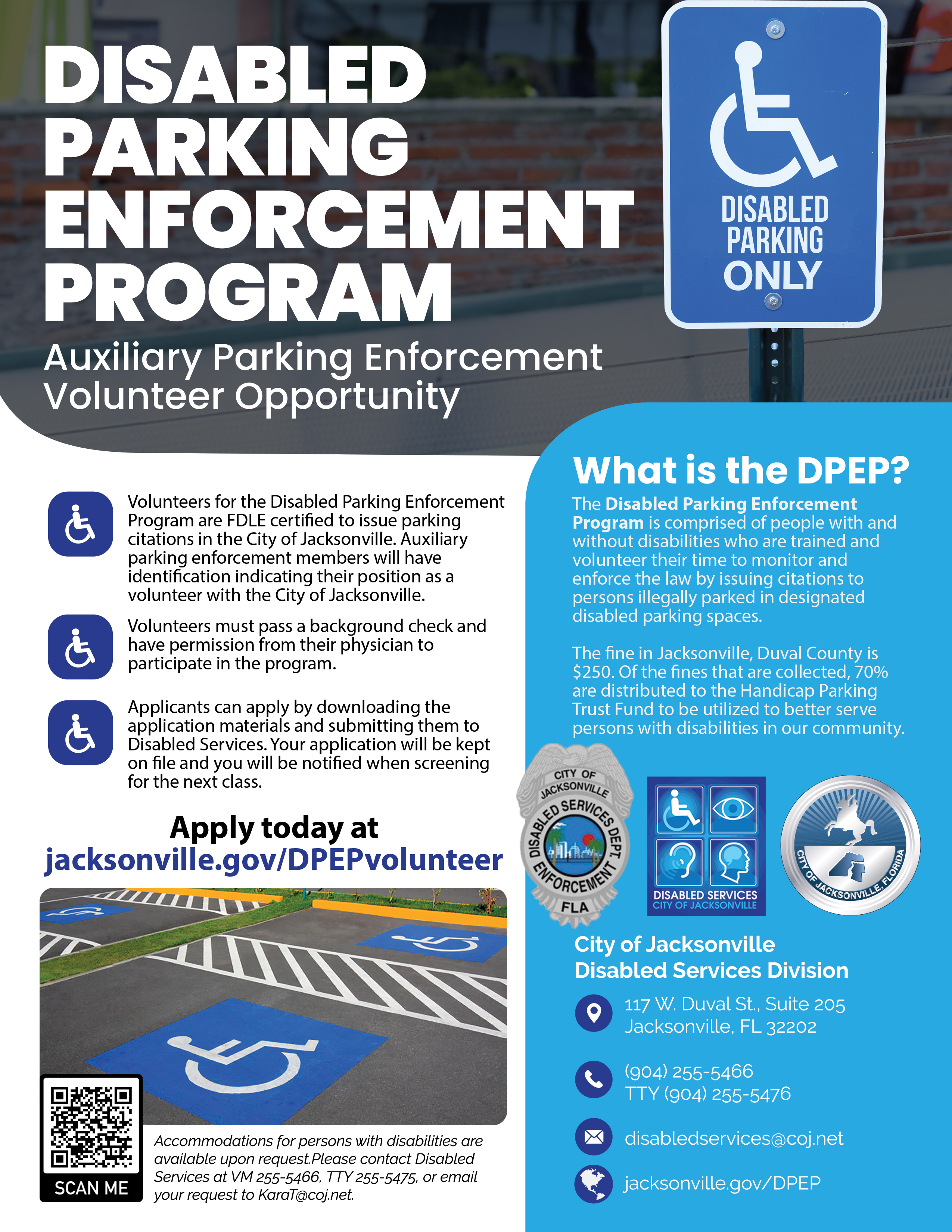 Volunteers for the Disabled Parking Enforcement Program are FDLE certified to issue parking citations in the City of Jacksonville. Auxiliary parking enforcement members will have identification indicating their position as a volunteer with the City of Jacksonville.