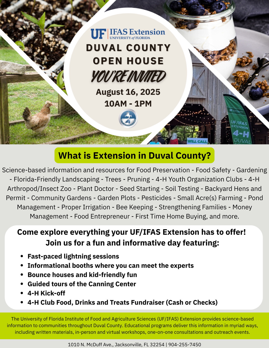 You're Invited to the UF/IFAS Duval County Extension OPEN HOUSE! Mark your calendar and stop in to learn about all the incredible services offered to the community and enjoy activities for the whole family.