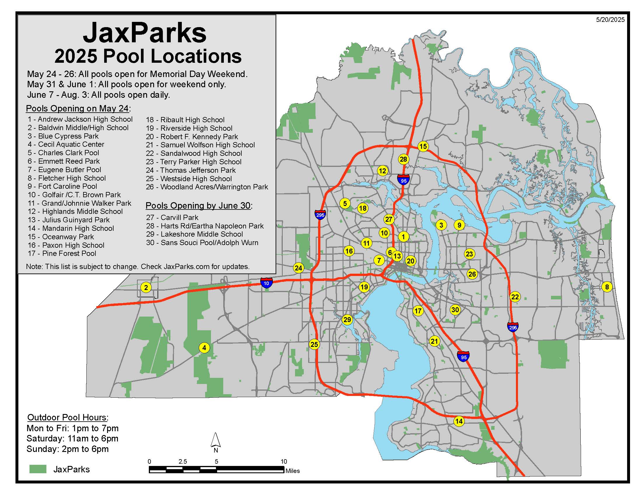 Post Season Outdoor Pool Hours **DCPS Sites Saturday, August TBD through Monday, September 7, 2026Saturday 11AM - 6PM Sunday 2PM - 6PM JaxParks Pools - Saturday, August TBD through Monday, September TBD Saturday 11AM - 6PM Sunday 2PM - 6PM |