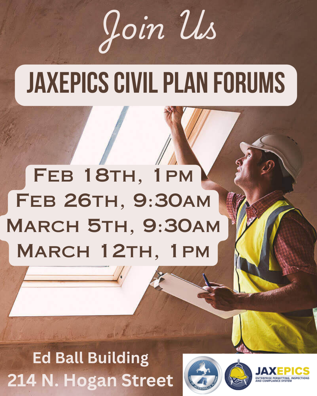 The Public Works Department and Development Services Division invite you our forum on the civil plans review migration to JaxEPICS! JaxEPICS Product Owner Elysa Chao will lead you through a demo overview of the new system that will go live February 28th. The demo will cover accounts, civil plans and plat organization in Development Plans and Projects, starting and managing submittals, notifications, payments, and end with an open Q&A. You are encouraged to bring your own device (laptop/tablet) to follow along.