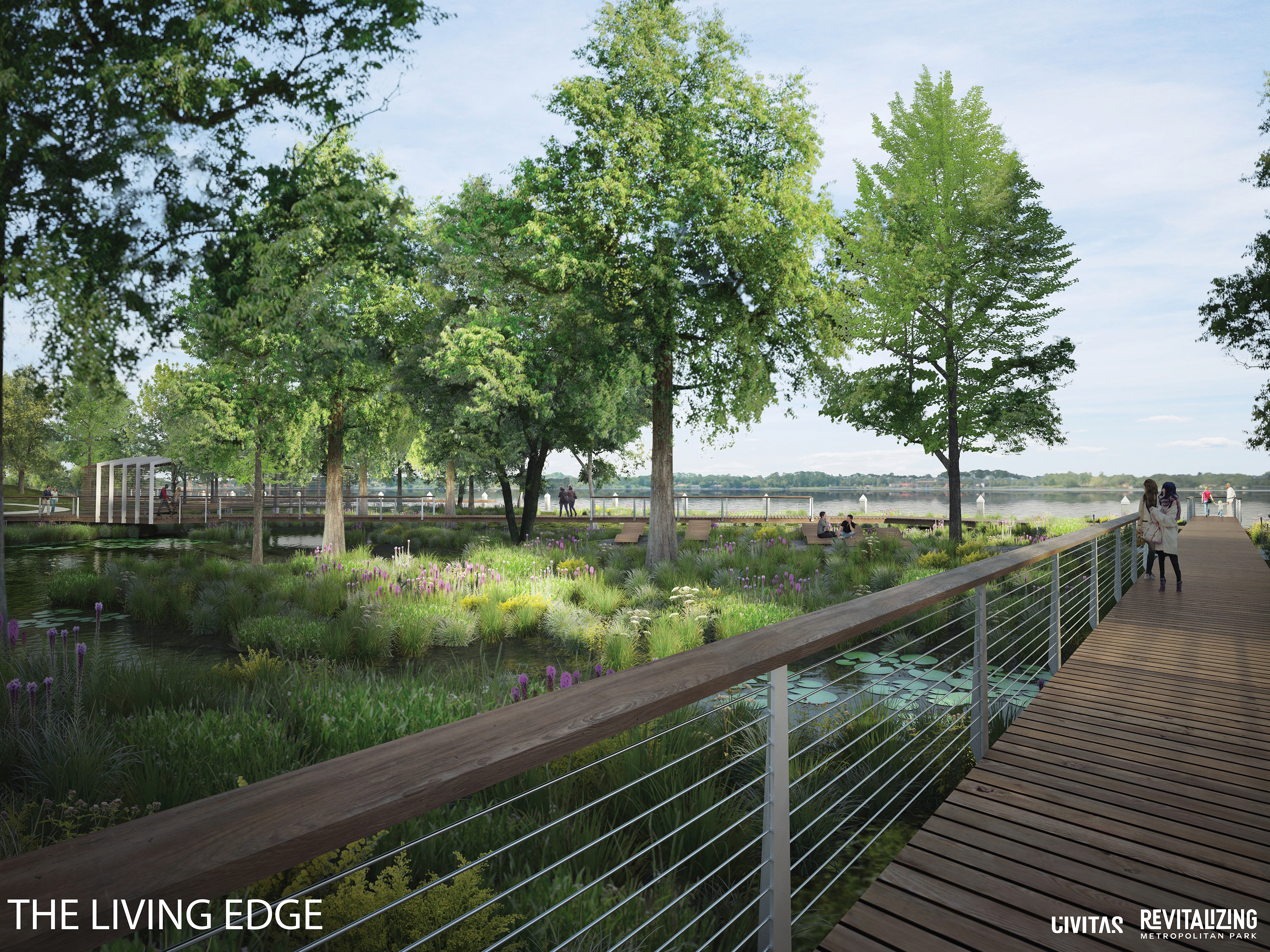 The revitalization of Metropolitan Park breaks from the heavily programmed and formalized park spaces typical of other riverfront parks. The proposed design focuses on a nature-based park experience that supports events of all sizes. With a resilient living edge river landscape, the design invites the community to explore and play in nature daily. Currently, the design concepts include The Tailgate Plaza, The Ramble, The Performance Lawn, and The Resilient River Edge