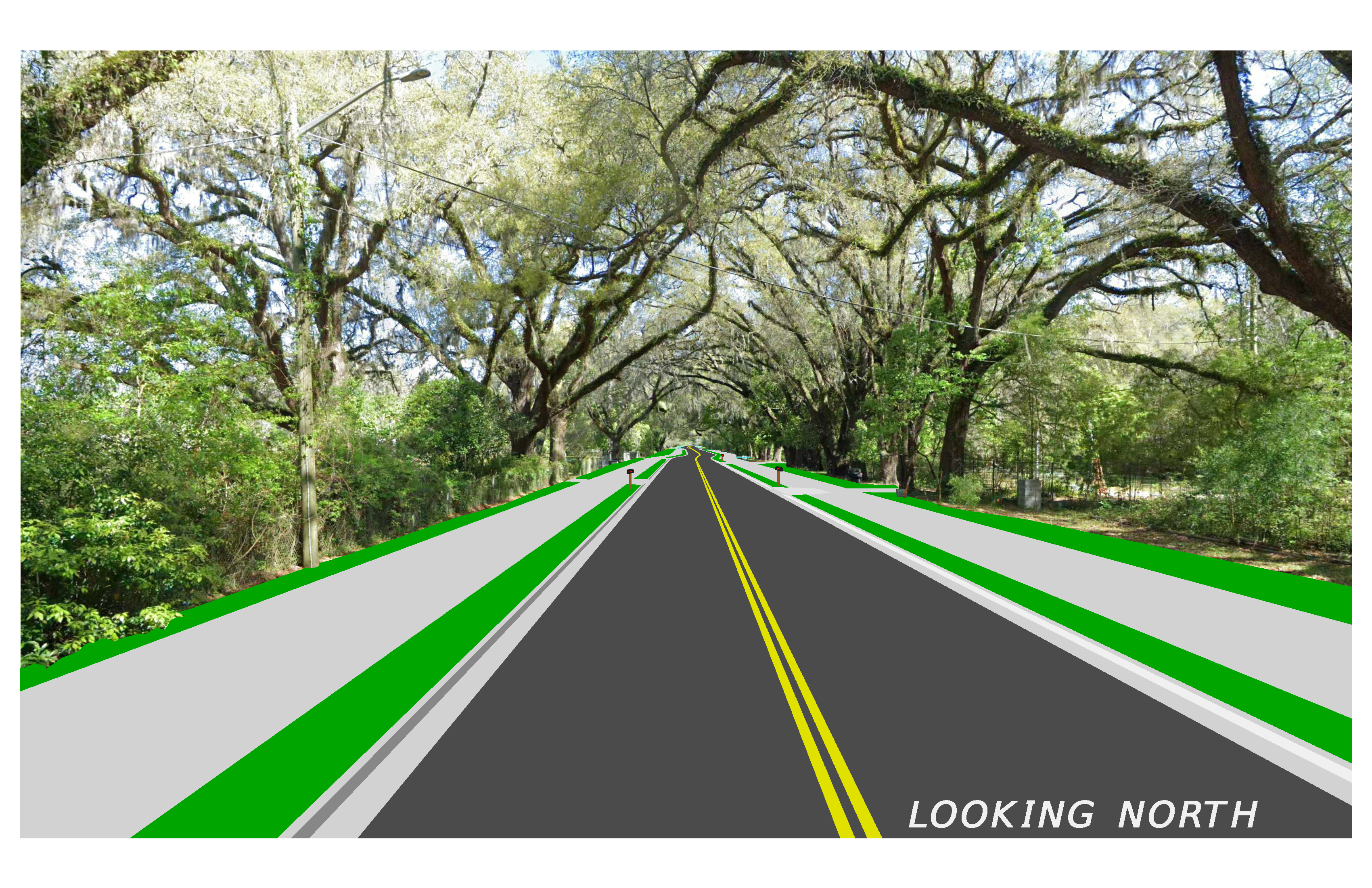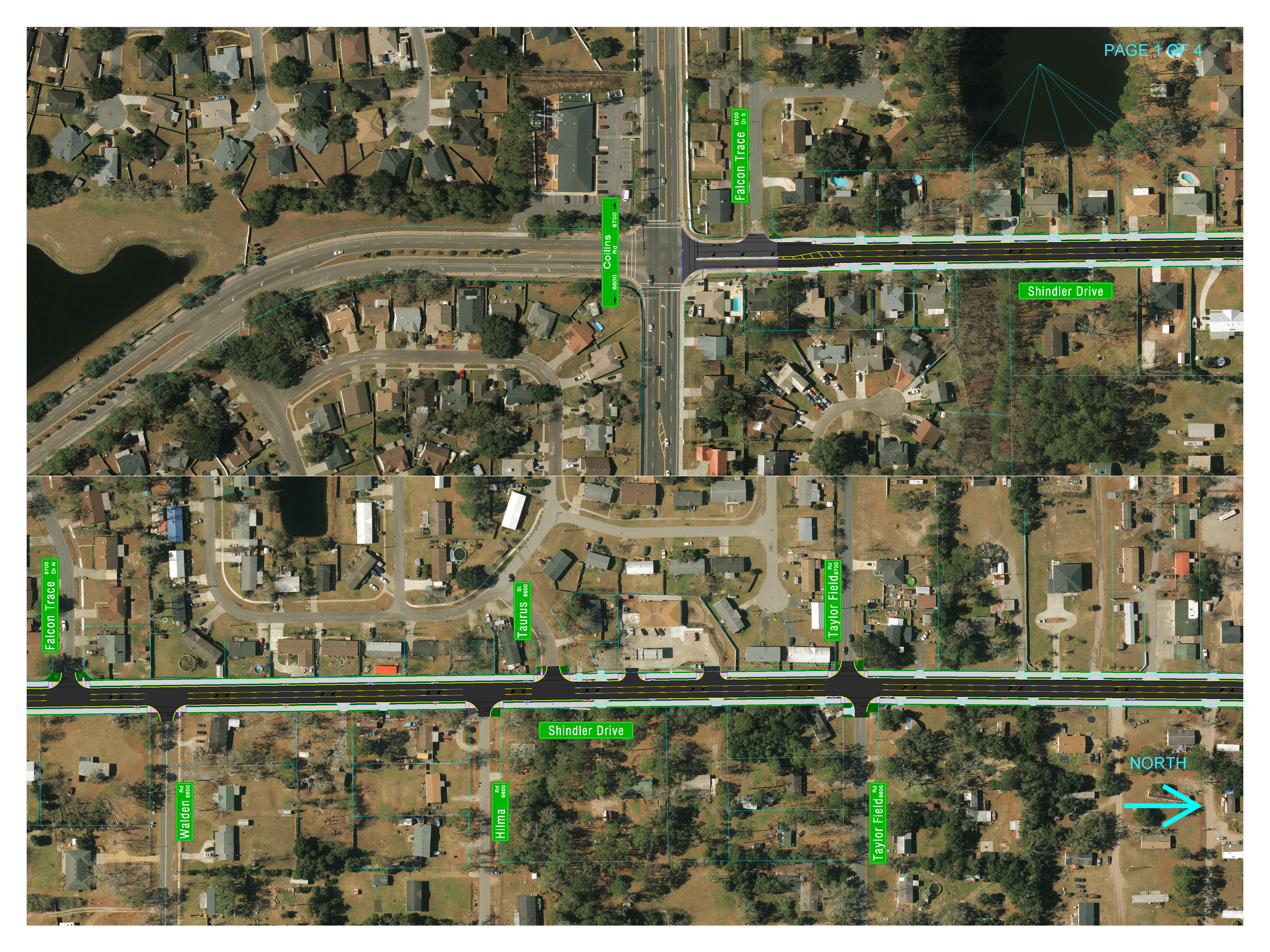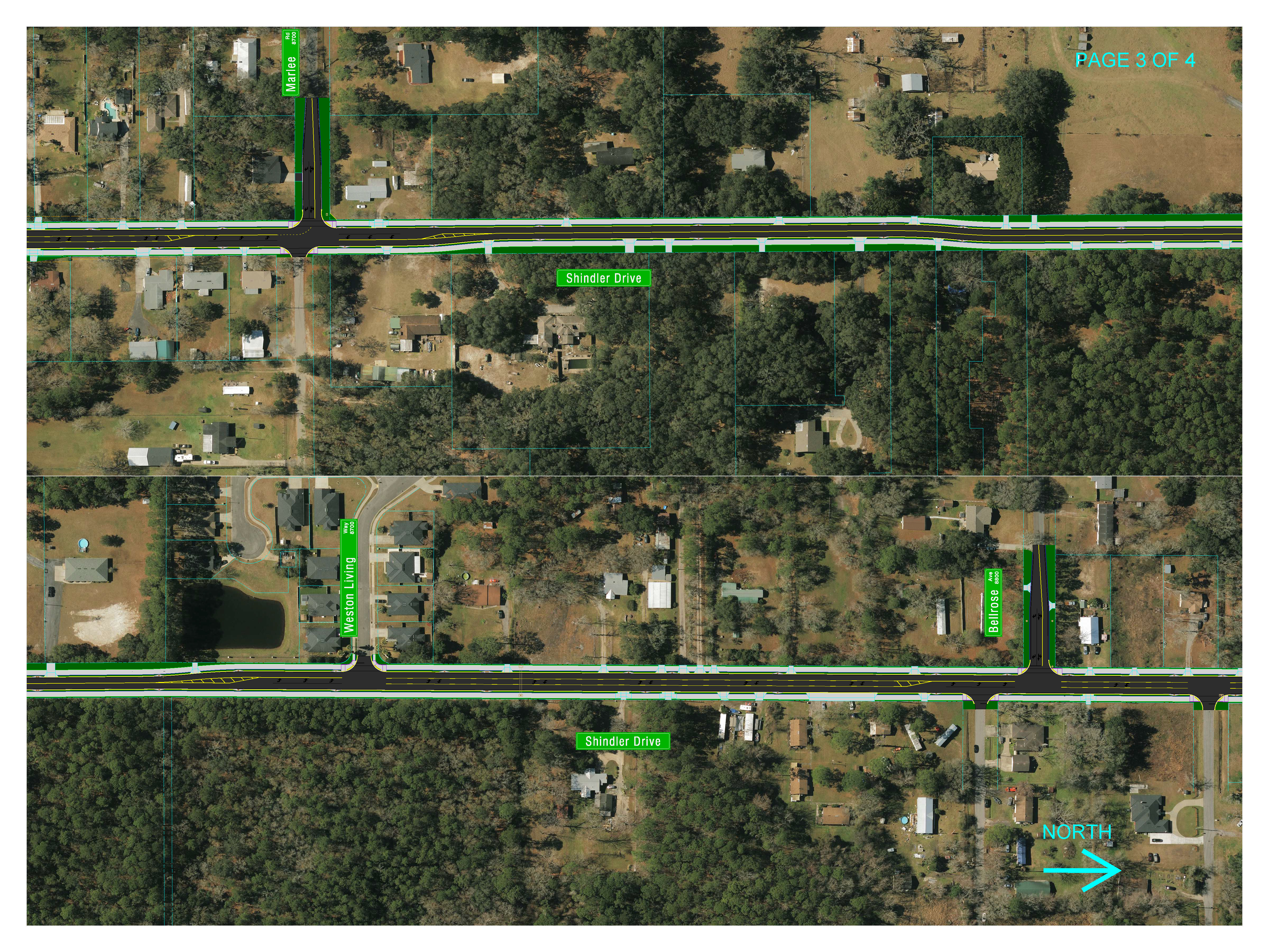 This 3-mile roadway improvement project will enhance vehicular, bicycle, and pedestrian safety along Shindler Drive between Collins Road and 103rd Street. The existing rural 2-lane roadway will be reconstructed into an urban roadway with curb and gutter, widened to three lanes except through a preserved oak tree canopy section, which will remain two lanes. The project includes 10-foot shared-use paths on both sides, upgraded drainage with inlets and storm pipes, bridge culvert replacement at Mile Branch Creek, intersection turn lane improvements, streetlight installation, and utility coordination. No new ponds will be constructed, and tree preservation is prioritized along the canopy corridor.