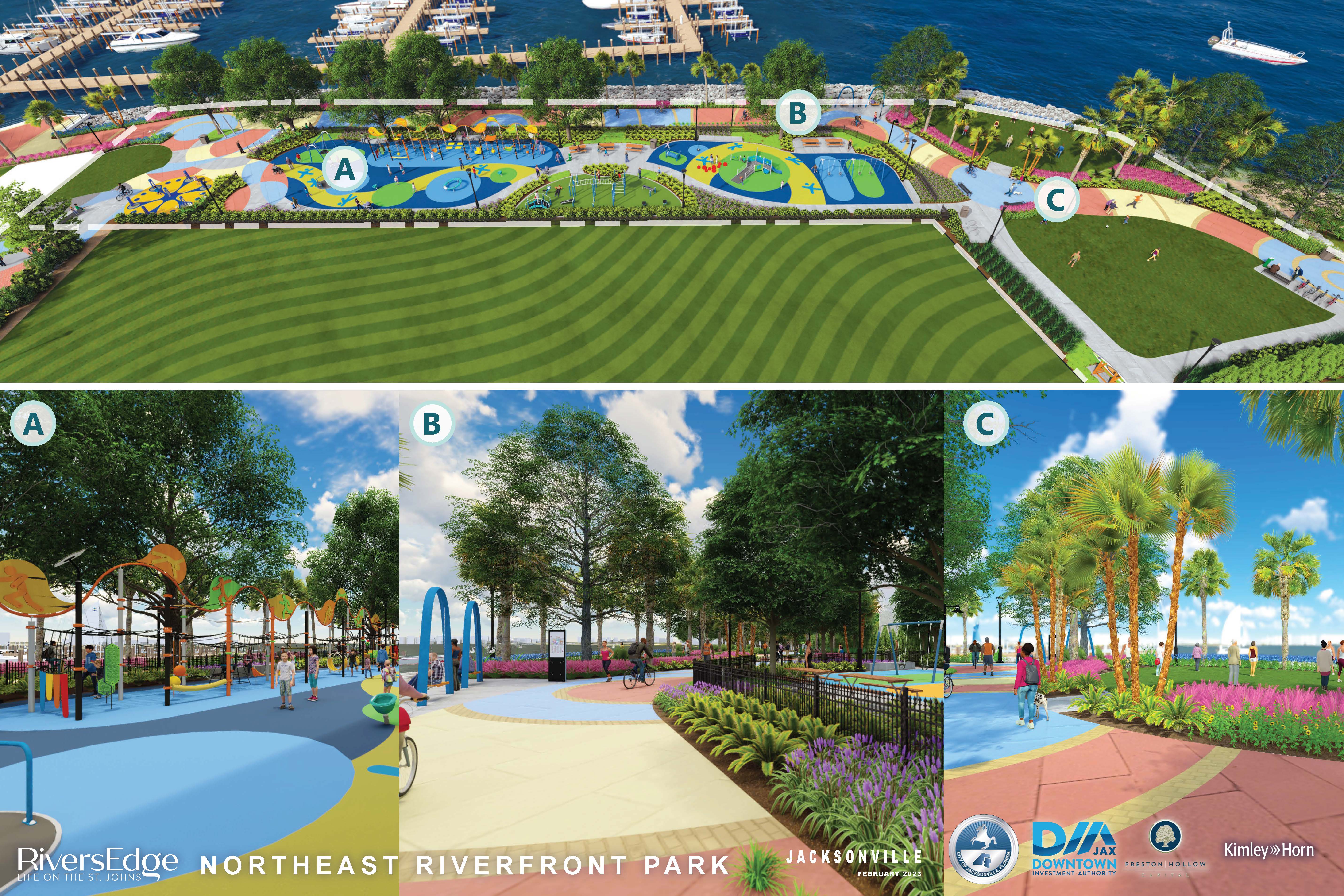 Phase 1 of Riverfront Plaza is now under construction and includes an elevated destination playground on top of a park pavilion building, a large flexible event lawn, as well as a new bulkhead, riverwalk, and a plaza space connecting Riverfront Plaza to the Jacksonville Center for the Performing Arts. The park pavilion building will include a small café space, restrooms, mechanical rooms and storage space to support the park. Phase 1 is slated to open to the public in early 2026, with the Riverwalk segment along Riverfront Plaza Park expected to open earlier by the end of November 2025. Phase 2 of Riverfront Plaza will include a beer garden, rain garden, and a bike and pedestrian connection to the Main Street Bridge. Phase 2 is anticipated to start in 2026 with an estimated completion, including the adjacent Riverwalk segment, in December 2027 / January 2028.