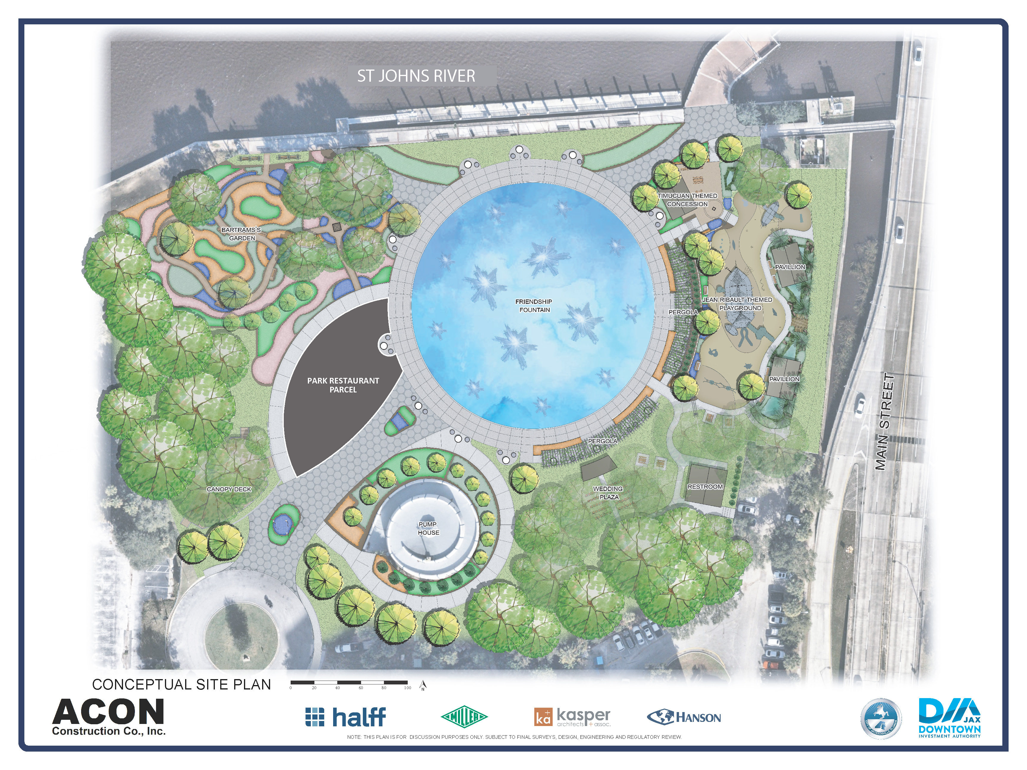 The City opened the new Friendship Fountain in February 2024 with a waterfall wall and nightly choreographed light shows. Work is underway on the remaining construction of the park, themed around “Exploring the St. Johns River”. The space will feature a history-themed play park, restrooms, a wedding venue, picnic areas and interpretive gardens to help tell the story of the city’s founding and the American Heritage River at the heart of our City.