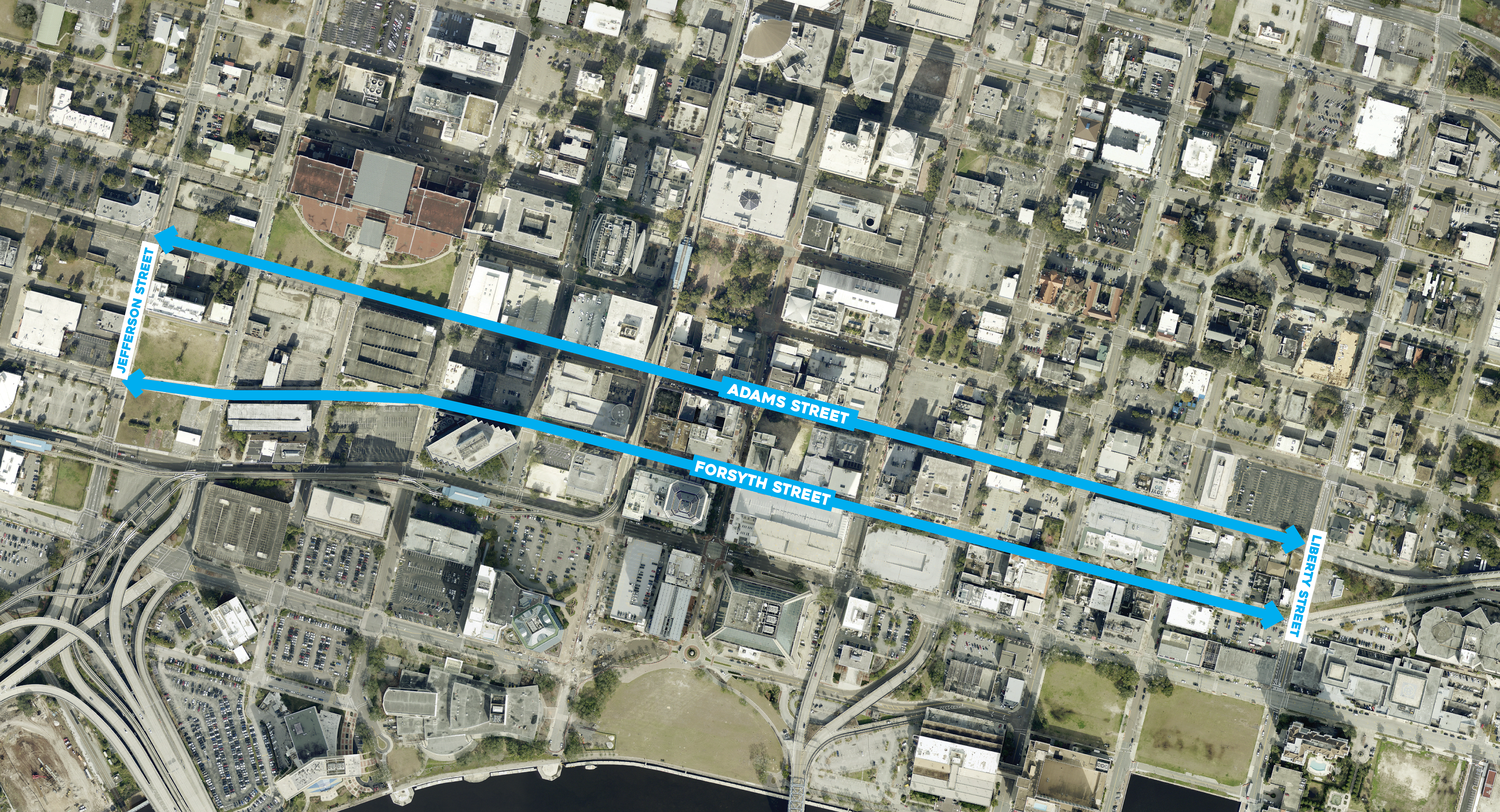 The reintroduction of two-way travel on our Downtown streets has been a priority in the Downtown master plan for decades. This initiative has been reinforced through subsequent Mobility Plan Updates and transportation projects, with dedicated tax increment funding from the Downtown Investment Authority allocated for implementation. Restoring two-way streets is proven to encourage economic growth, boost property values, and support more efficient use of on-street parking and rideshare services. It also enhances retail visibility and occupancy rates, improves walkability and pedestrian safety, increases sidewalk activity, and elevates residential demand and quality of life. This transformation begins Downtown with Forsyth and Adams Streets, both of which run through the DIA’s targeted dining districts. Current work includes two-way conversions, signalization, paving, striping, sidewalk expansion areas and parking kiosks. This work will be immediately followed by sidewalk widening, tree planting and enhanced streetscapes.