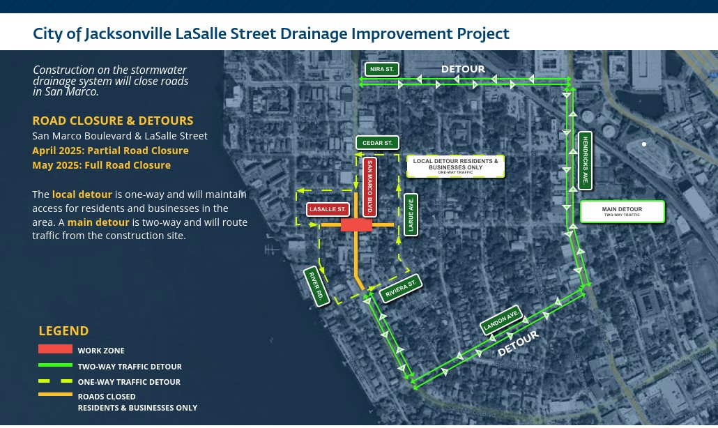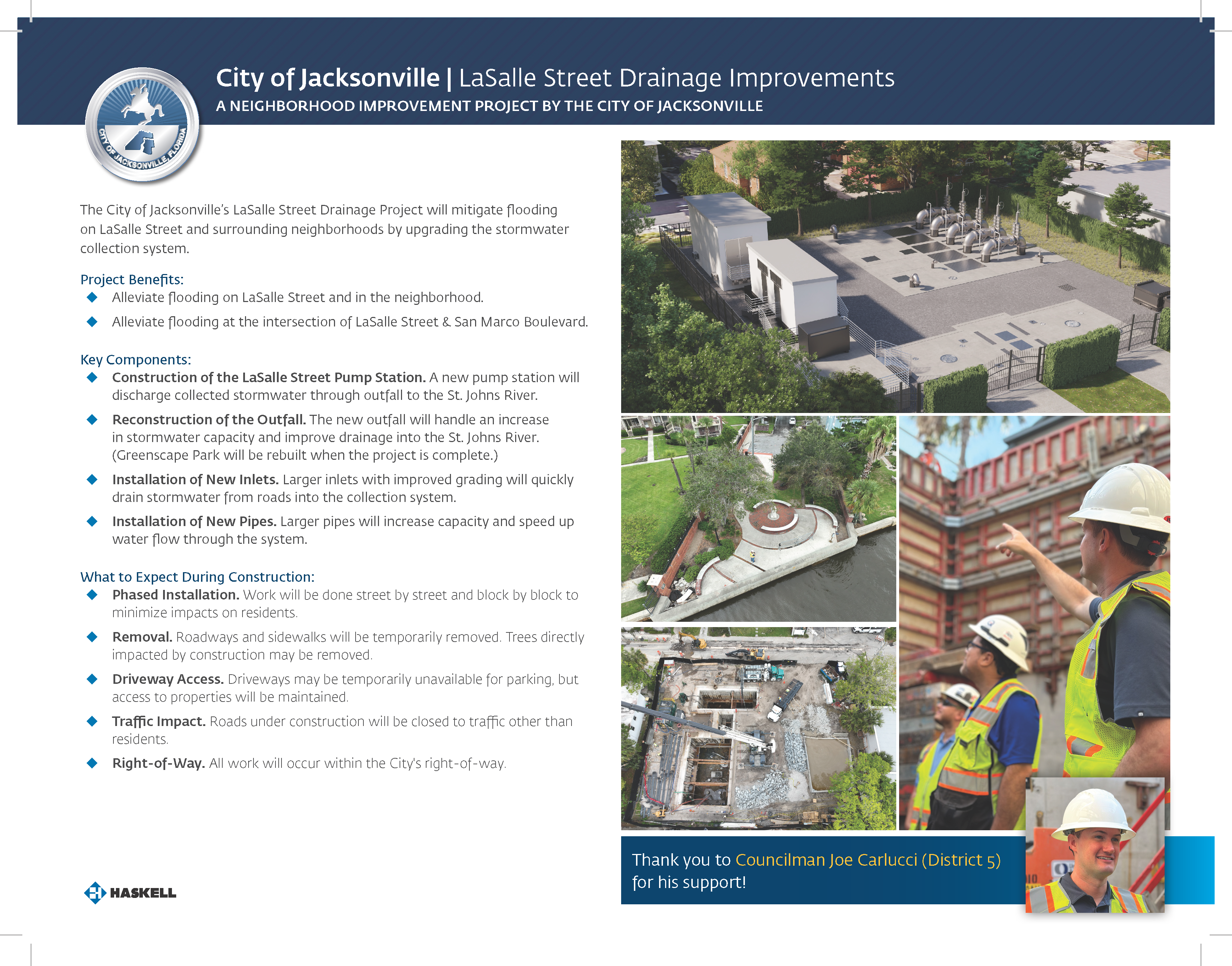 This two-phase infrastructure project will reduce flooding along LaSalle Street and in the surrounding San Marco neighborhood by upgrading the stormwater collection system. Improvements include a new pump station, stormwater outfall, and expanded underground drainage.