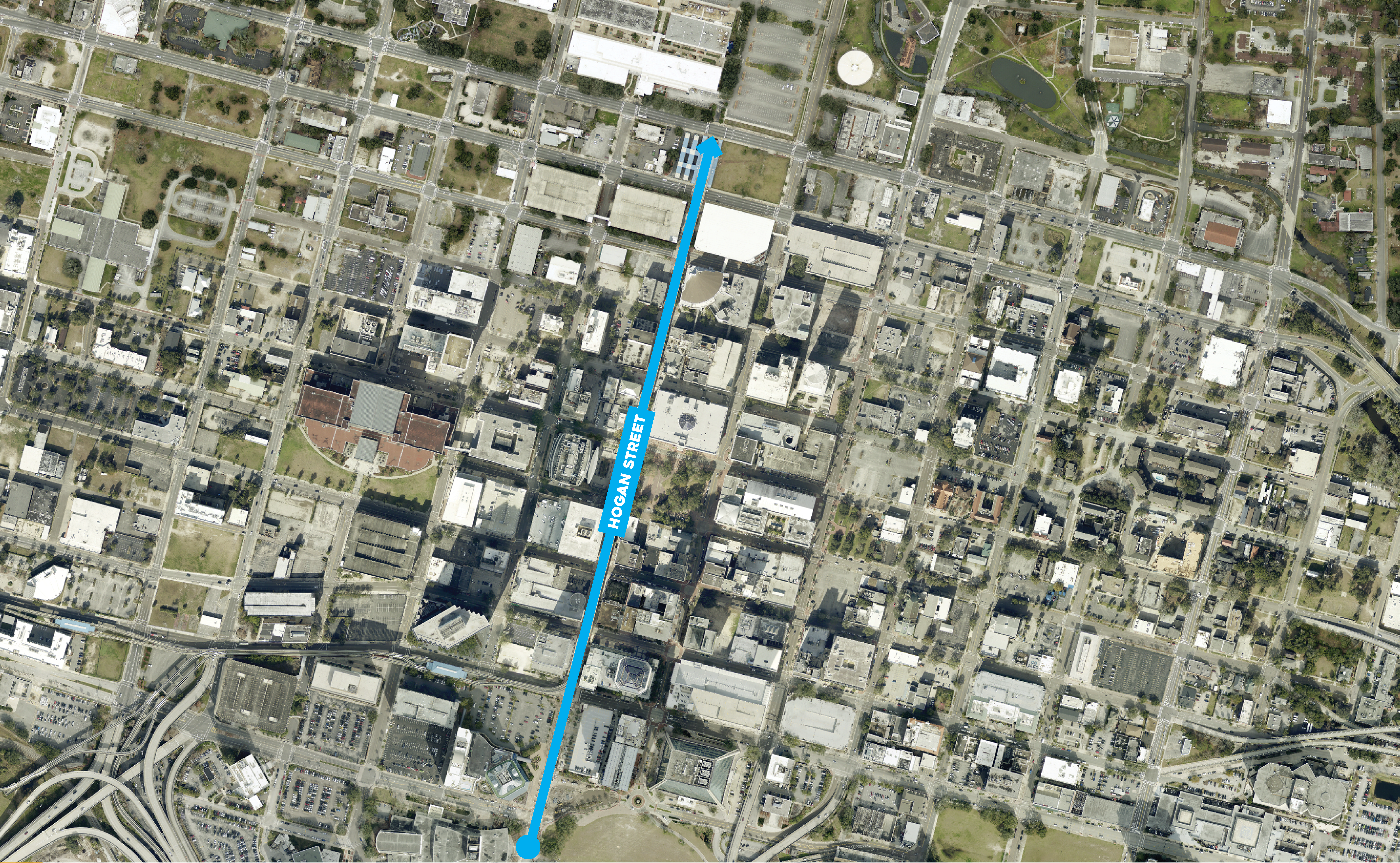 The Hogan Street Cycle Track is an Emerald Trail segment that will provide a connection between the future Hogan Creek Greenway trail and the Northbank Riverwalk. Within Downtown, the Hogan Street segment will feature a cycle track along the west side of Hogan Street, adjacent to the pedestrian sidewalk. To accommodate this design, Hogan Street’s one-way roadway will be reconfigured, reducing it from two travel lanes to one. This transformation will extend from West State Street to Bay Street, creating a safe and inviting corridor dominated by pedestrian and bicycle activity. The final block, from Water Street to the Northbank Riverwalk, will transition into a shared-use side path, ensuring a seamless connection to the riverfront.